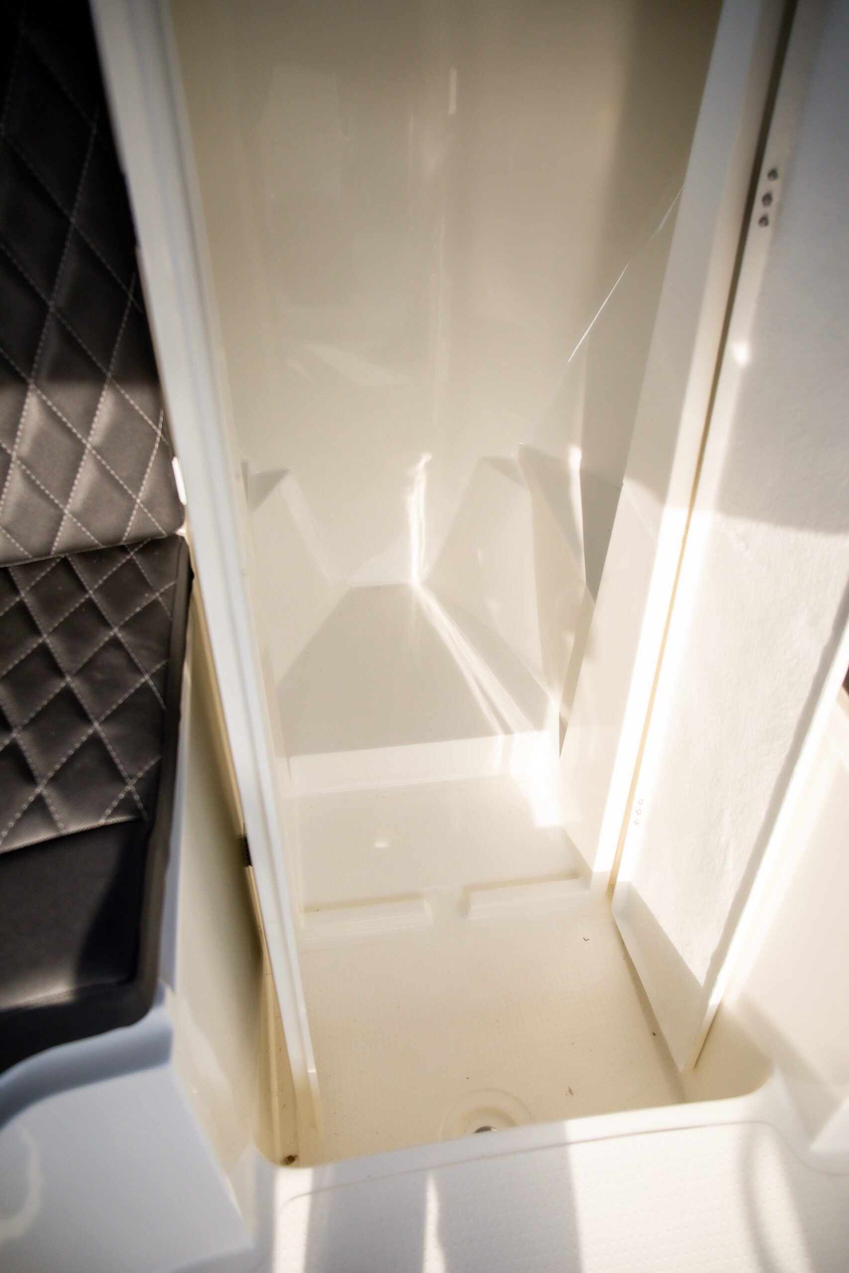 - Afgesloten ruimte in de punt, geschikt voor het plaatsen van een toilet (achter wegneembaar kussen)
